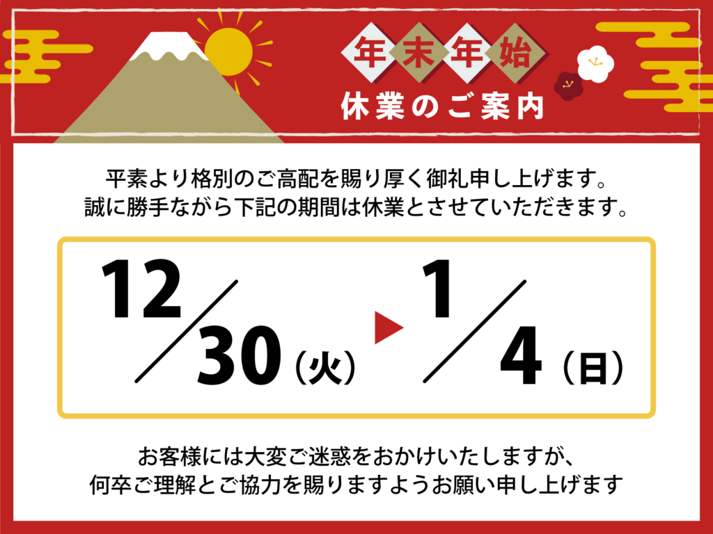 休業期間:2025年12月30日(火)~2026年1月4日(日)